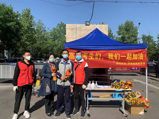 “高三考生們,我們一起加油!” 在領(lǐng)秀城秀柏社區(qū)的防疫志愿服務(wù)站,一條大紅色的條幅,一朵朵象征著太陽(yáng)與光明、生機(jī)與活力的太陽(yáng)花在陽(yáng)光的照射下格外絢爛醒目。今天是五一勞動(dòng)節(jié)也是高三考生因疫情封閉后第一天復(fù)課的日子。 在這個(gè)特別的節(jié)日里,領(lǐng)秀城秀柏社區(qū)的防疫先鋒隊(duì)第一小組組長(zhǎng)榮峰提前一天就定購(gòu)好了100朵鮮花,一大早,當(dāng)高三學(xué)生走到小區(qū)門口,志愿者們就將一朵朵鮮艷的太陽(yáng)花和祝??ㄋ偷綄W(xué)生手中,“想起了向日葵就想起了陽(yáng)光,微笑和美好常在,我們一起加油!” “叔叔,太謝謝你們了,你們?cè)诩影嗉狱c(diǎn)為我們服務(wù),還給我們送花,真是讓我倍受鼓舞?!薄疤兄x你們了,謝謝志愿者們這些日子以來(lái)對(duì)我們