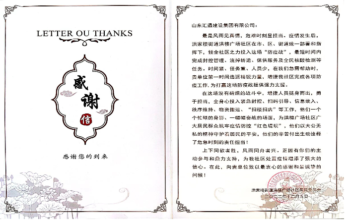 “抗疫奮戰(zhàn) 堅守一線 共駐共建 情暖民心” 。12月5日,洪樓廣場社區(qū)黨支部書記尹延偉給集團(tuán)匯通公司下沉社區(qū)服務(wù)隊送來錦旗和感謝信,表達(dá)了對志愿隊在此次抗擊疫情期間不分晝夜、義無反顧堅守一線的高度贊揚(yáng)和誠摯謝意。