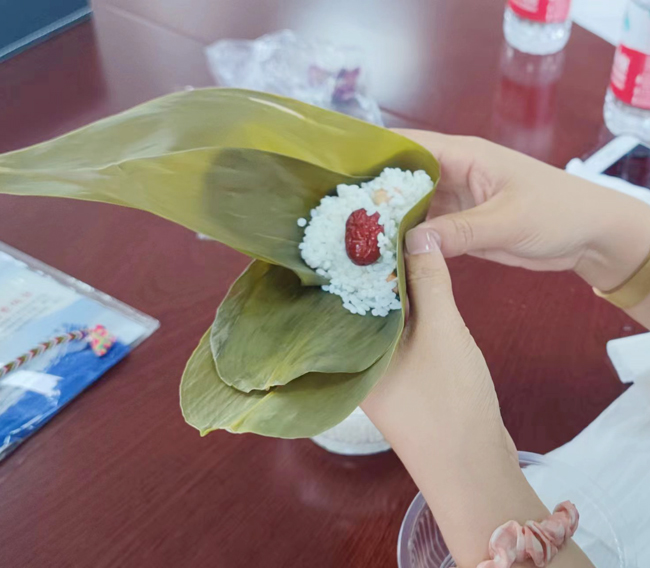 最后一個環(huán)節(jié)包粽子,提前泡好的糯米、粽葉、大棗、粽線等材料,職工們在老師的指導下互幫互學,卷幾片粽葉、抓一把糯米、放一顆紅棗,雖然很多職工是第一次包粽子,但大家按照步驟一步一步操作,包的是有模有樣,樂在其“粽”。活動現(xiàn)場歡聲笑語、其樂融融。